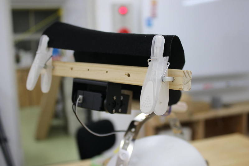 このマシーンに使っている洗濯ばさみは、板の両サイドに穴をあけ、そこに結束バンドを通してくっつけています。工作をしていると、こういうしょうもない知見がどんどん溜まってきます。