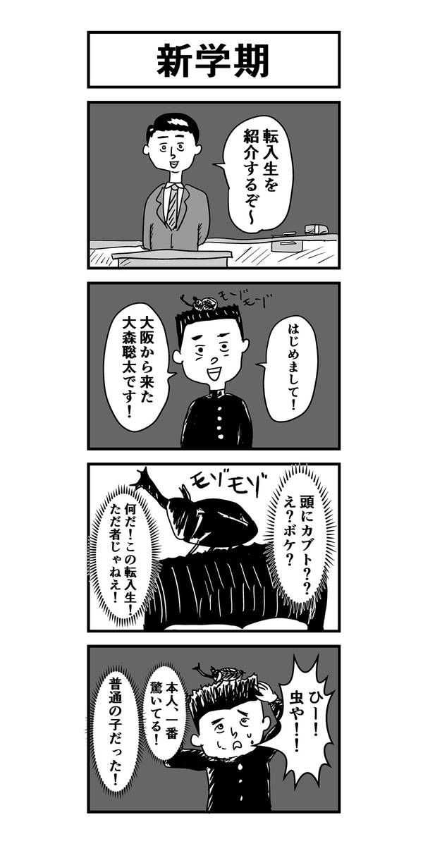 さらに、最初は、東京から来た転入生にしようと思ったんですが、大阪からにすることで迎える側の生徒達は「これはボケなのか??」と混乱できると思ったり、あと四コマ目の転入生のセリフですが「カブトムシや!」って叫ぶより「虫や!」って叫ぶ方が、このカブトムシと転入生になんの縁(ゆかり)もない感じが出るのでいいなとか、そんな演出的なアイデアも加えてます。演出には好みが出しやすいので、オリジナリティに繋がるポイントだと思います。