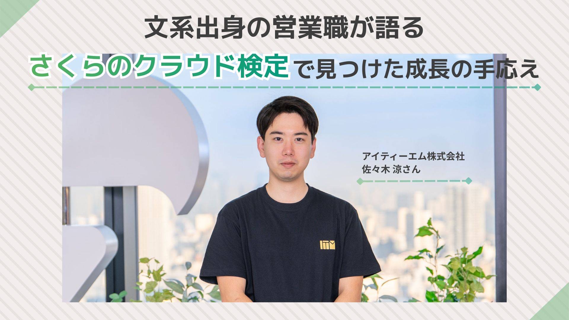 今回は、さくらのクラウド検定に合格した佐々木 涼さんにインタビュー。さくらインターネットのグループ会社であるアイティーエム株式会社で営業に従事している佐々木さん。1度目の試験では不合格だったものの、再挑戦し、2度目の試験で見事合格を果たしました。