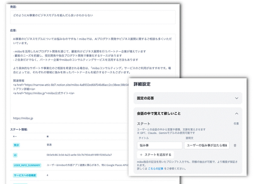 ユニークな機能の1つに「ステート」があります。miiboで開発したAIエージェントとユーザーの会話内容から、名前、職業、趣味などの属性情報を自動で抽出することができます。この抽出された情報をもとに、「悩みごと」などをあらかじめプロンプトで埋め込むことで、よりユーザーの感情に寄り添ったパーソナライズ体験を実現しました。