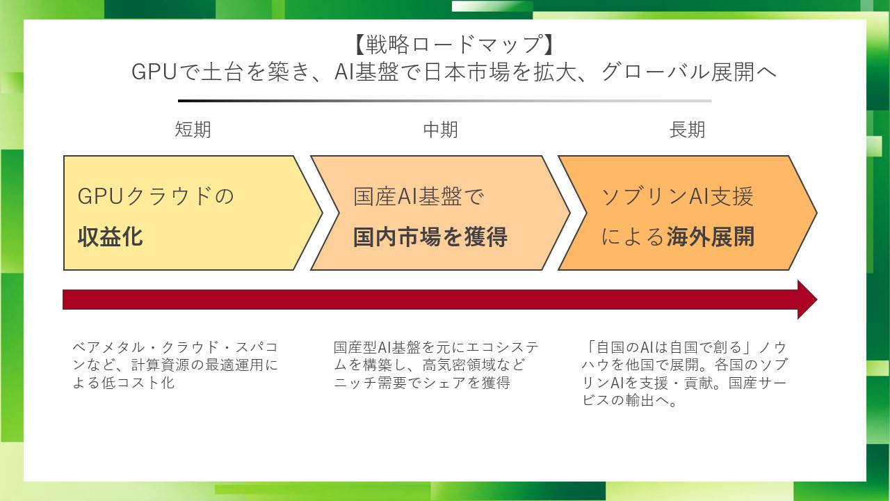 同時に、規模やシェアの拡大を見据えています。さらに、AI産業を創るノウハウを他国のソブリンAI支援や発展拡大に活かし、グローバル展開も視野に入れた構想を描いています。