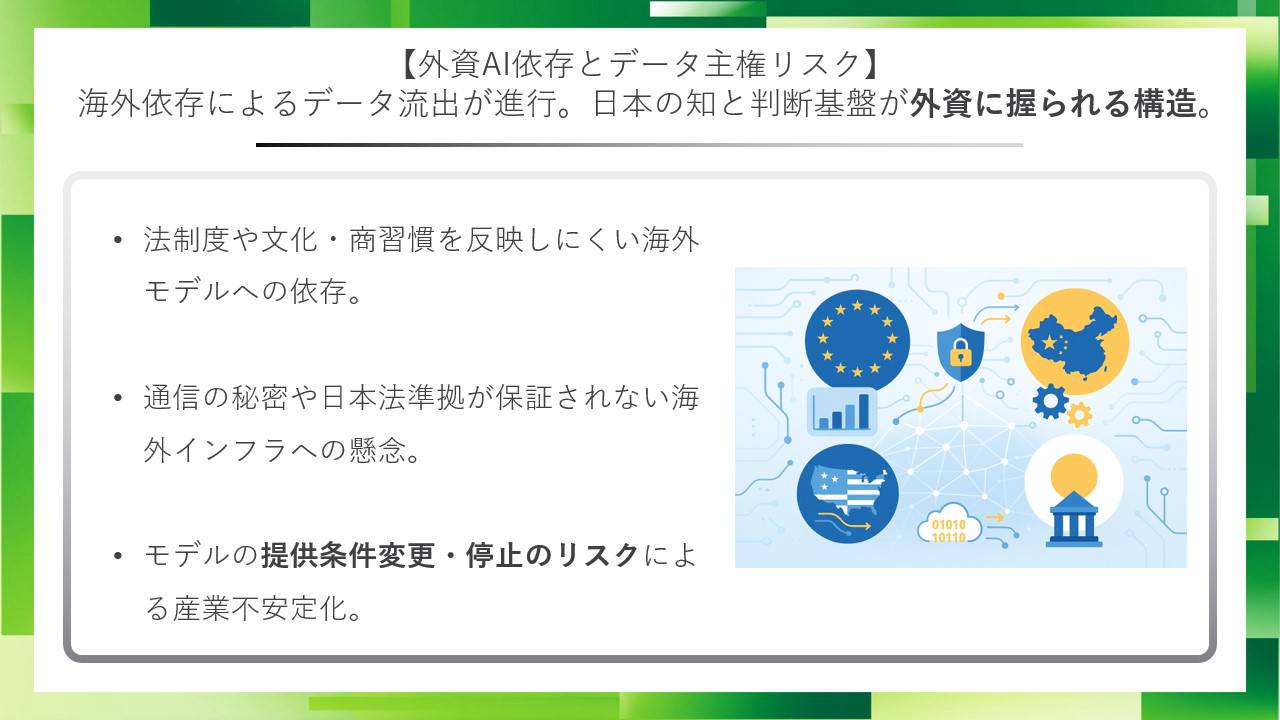 日本語のデータ、国内のデータではない部分で生まれてきたAIに価値判断を委ねるという文化的なリスクも生まれています。経済面から文化面まで、非常に大きなリスクのある状態です。