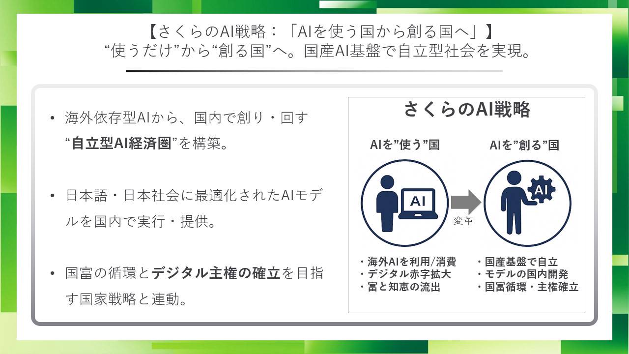 こうした状況で当社が考えている戦略・方向性は、「AIを使う国から、創る国へ」ということです。AIを消費して富が失われていく国から、国産AI基盤を使って発展していく国へ。そのためにインフラ事業者の立場から貢献できるのではないかと考えています。