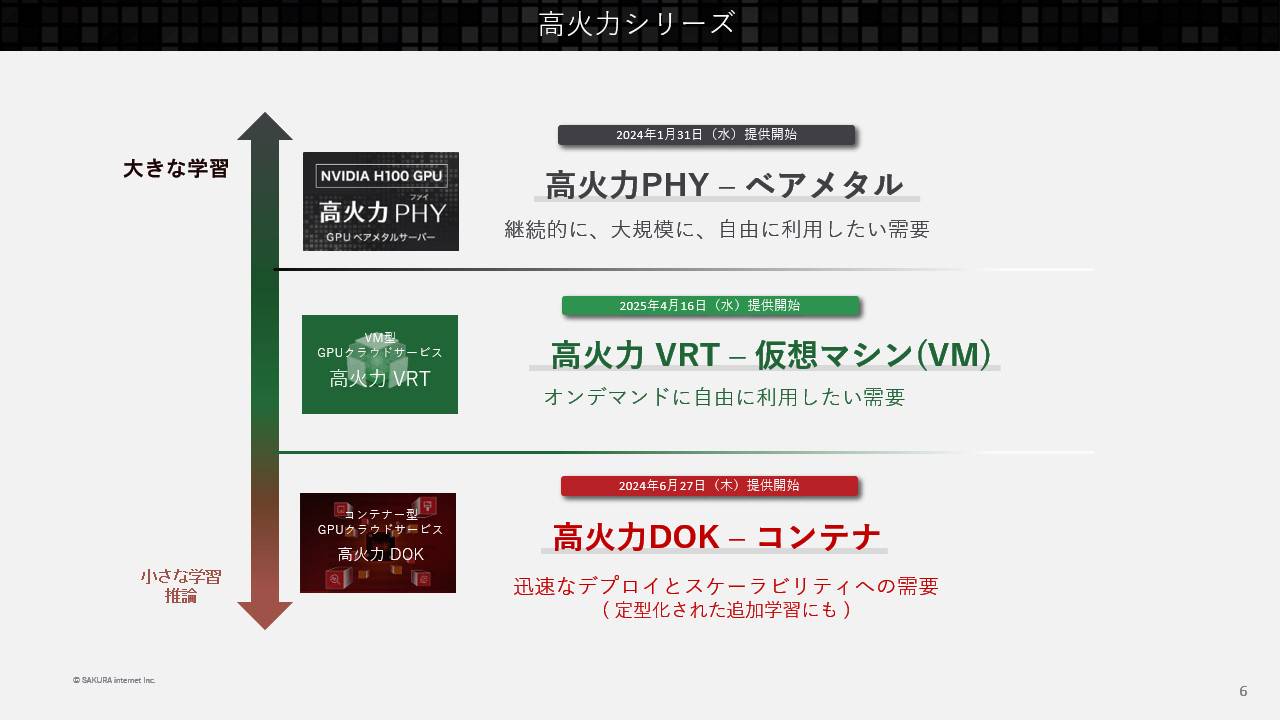 当社のGPUサービスは「高火力シリーズ」というブランド名で、ベアメタル、VM(バーチャルマシン)、コンテナといったさまざまな形態で提供しています。