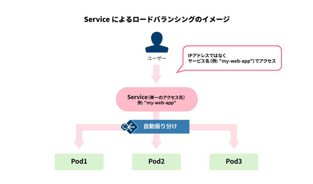 Serviceは、複数のPodへのアクセス窓口を提供します。たとえば、同じWebアプリケーションの Pod が3つ稼働している場合(1つのアプリケーションを3つに複製して負荷分散)、Serviceが自動的にトラフィックを3つに振り分けます(ロードバランシング)。Podが増減しても、アクセス先は「Serviceの名前」だけで済むため、管理が簡単です。