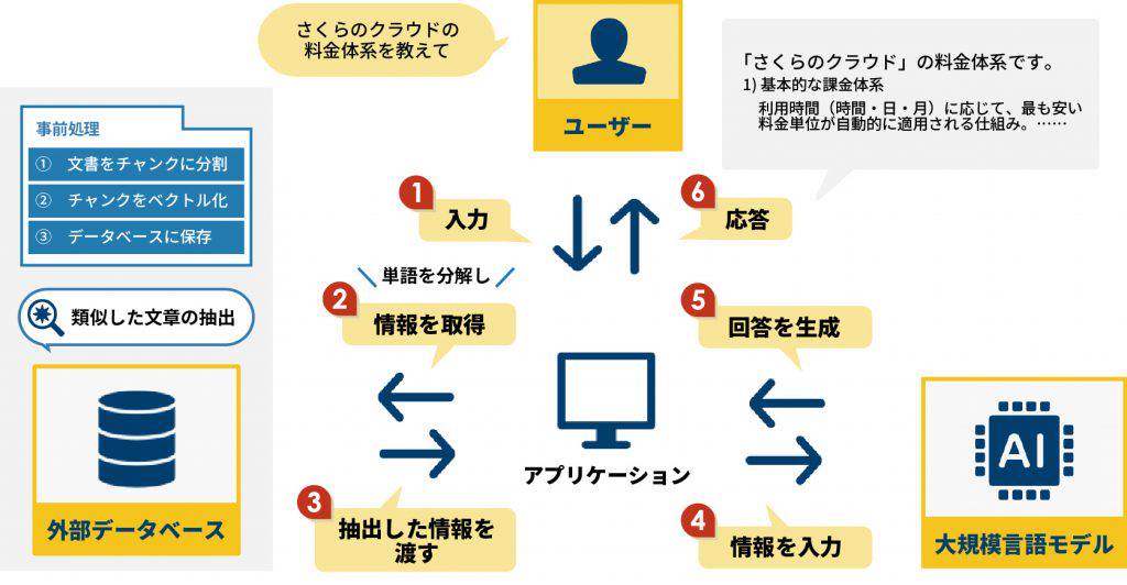 | 検索フェーズ | 1 ユーザー入力をベクトル形式に変換 2 外部データベースから関連性の高い情報を取得 3 必要なデータをフィルタリング |